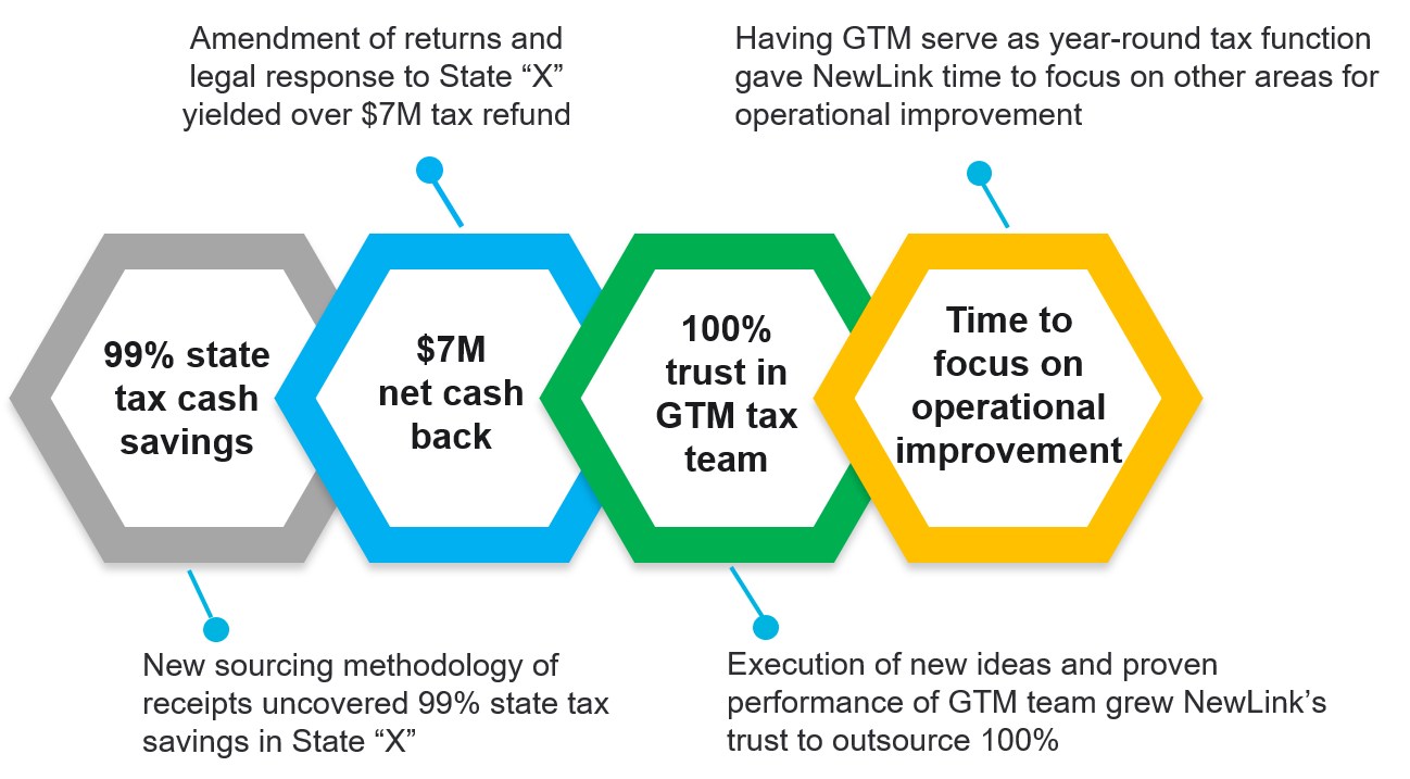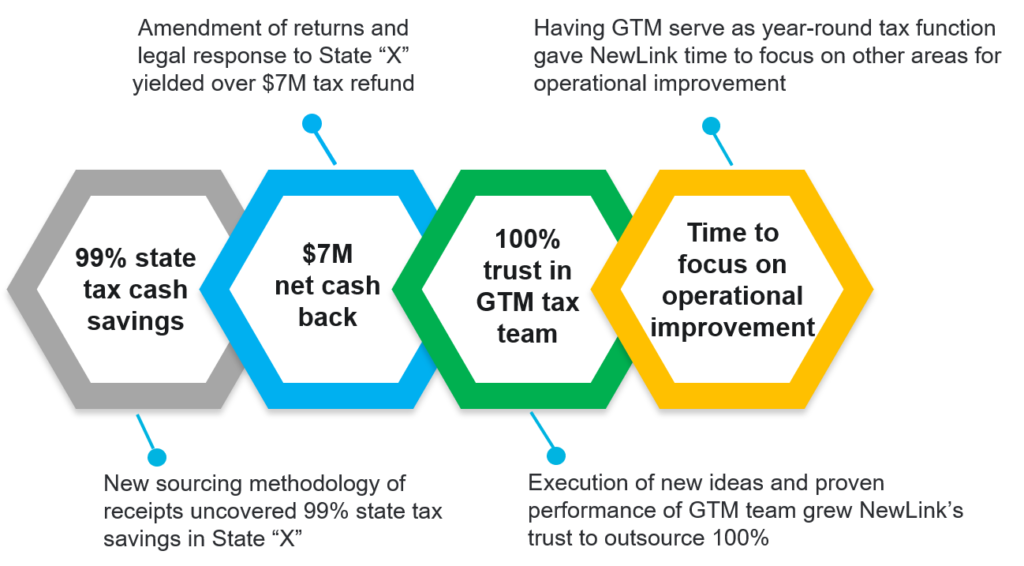 The key to identifying NewLink’s opportunity for tax savings was hiring tax experts that included director-level specialists on the front line asking the right questions, listening to answers, and taking a fresh look at NewLink’s filings and liabilities in real-time. By taking a deeper dive into their state taxes, GTM reviewed the Company’s state filing posture, including nexus-creating activities and receipts sourcing methodologies. Based on GTM’s knowledge of the industry, knowledge of the company, and state expertise, GTM identified opportunities and exposures leading to substantial tax savings and exposure mitigation. GTM’s analysis exceeded expectations by taking a holistic view across the provision AND compliance processes. This led to GTM providing position options which mitigated exposures and the discovery of other opportunities along the way.