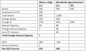 Over-allocation of expenses to foreign income is particularly problematic for taxpayers in an excess credit position in the GILTI FTC basket. For many taxpayers subject to tax rates on foreign income above 13.125%, expense allocation to GILTI results in residual U.S. taxation (after FTCs), and no carryforward of excess GILTI FTCs is permitted. Although regulatory changes have somewhat reduced this problem (e.g., the treatment of CFC stock as partially exempt assets[1] and the GILTI high-tax exception election[2]), worldwide interest expense apportionment under Section 864(f) may still be beneficial in many fact patterns.