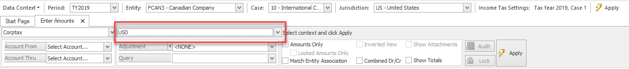 In order to prepare Form 5471, many companies would historically have imported both U.S. Dollar and Functional Currency ledgers into case 1 and case 10, respectively. Corptax 2020.2 includes the release of the “USD Ledger.” From a process standpoint, this means that preparers can group data under one case, bridging both USD and functional currency into their international compliance case, which is case 10 for most companies. The USD ledger can be accessed in the context window of the “Enter Amount” screen and by selecting the drop-down menu as shown below. This same ledger will be utilized when importing U.S. dollar trial balances into the software.