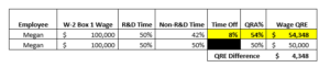 - Did the company appropriately compute everyone’s qualified research activity allocation percentage appropriately? Employees who contribute 80% or more of their time to QRAs can be included in the calculation as 100% of their total W-2 Box 1 wage amount for that year. “Time Off” or time when no activities were performed at the company (e.g., vacation, holiday, sick time, jury duty) at an individual level should be removed from the equation in computing everyone’s QRA allocation percentage. For example, if an employee makes $100,000 and spends 50% of her time on QRAs and the remaining time on non-R&D activities and four weeks of Time Off (roughly 8% of her total time) there is a considerable difference in what should be computed as her portion of wage QRE by making the adjustment to Time Off as opposed to simply applying 50% to her wage amount.